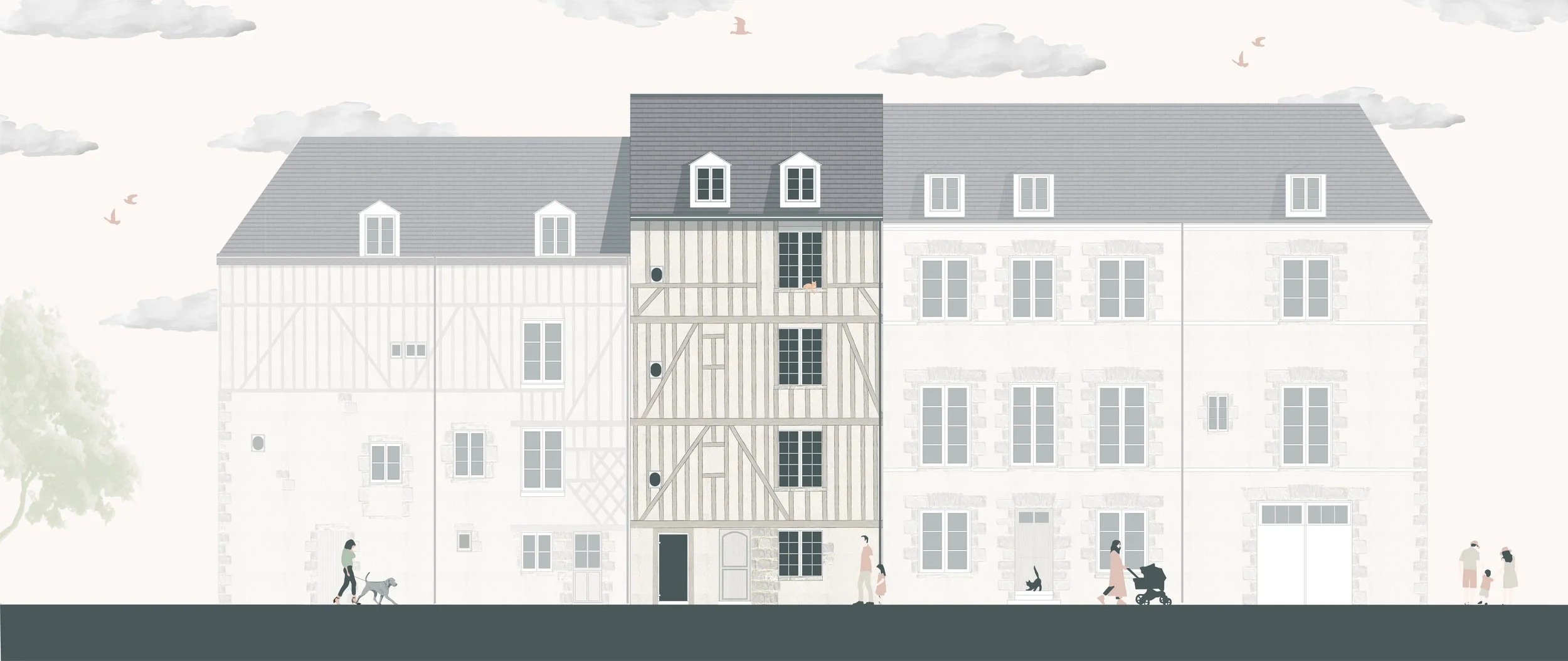 Ce projet prend place au dernier étage d’un immeuble historique du XVe siècle. Il s’agit d’un bâtiment à colombages, situé à proximité de la Loire, et mansardé en double hauteur. L’idée est de recomposer l’espace afin de transformer un studio avec mezzanine en un T2.