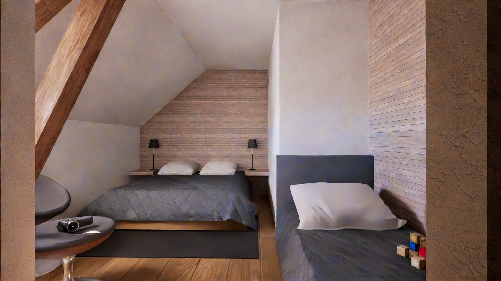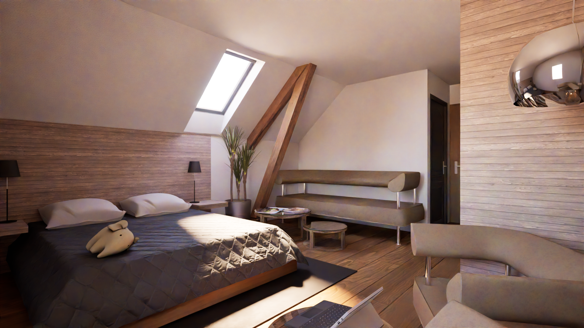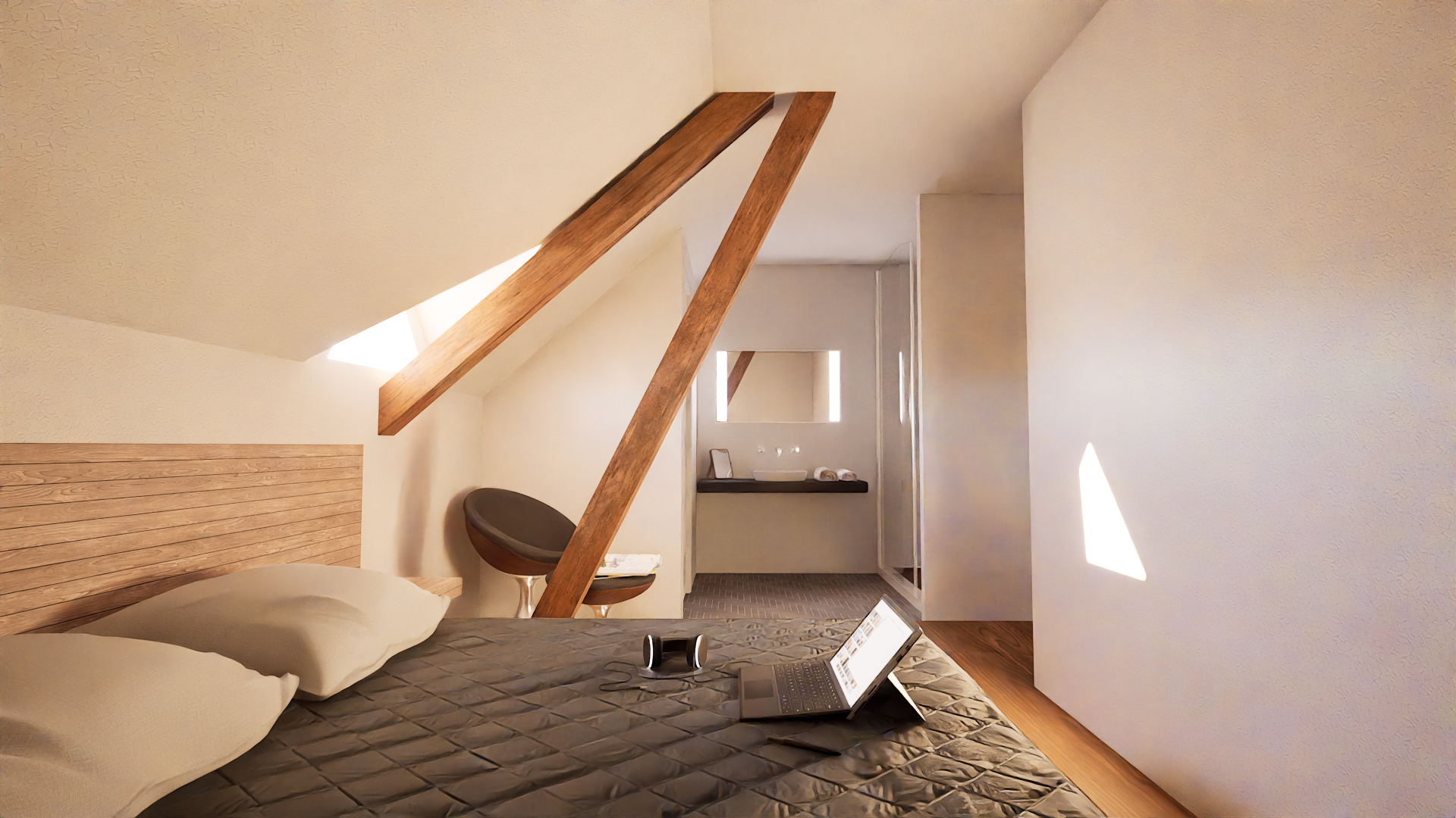 L’enjeu principal réside dans l’aménagement de volumes contraints, typiques des combles, en intégrant quatre typologies de chambres distinctes, adaptées aux variations de hauteur sous plafond, à la charpente visible et aux percements possibles. Une attention particulière est portée à l’éclairage naturel, avec l’intégration de châssis de toit, lucarnes ou ouvertures ponctuelles selon les orientations disponibles.